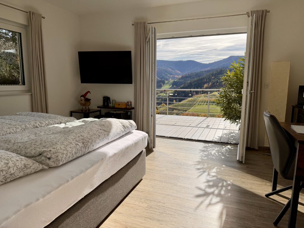 Vom 1,80 m breiten Boxspringbett aus kann man gemütlich fernsehen und hat einen fantastischen Blick auf die gegenüberliegenden Berge.